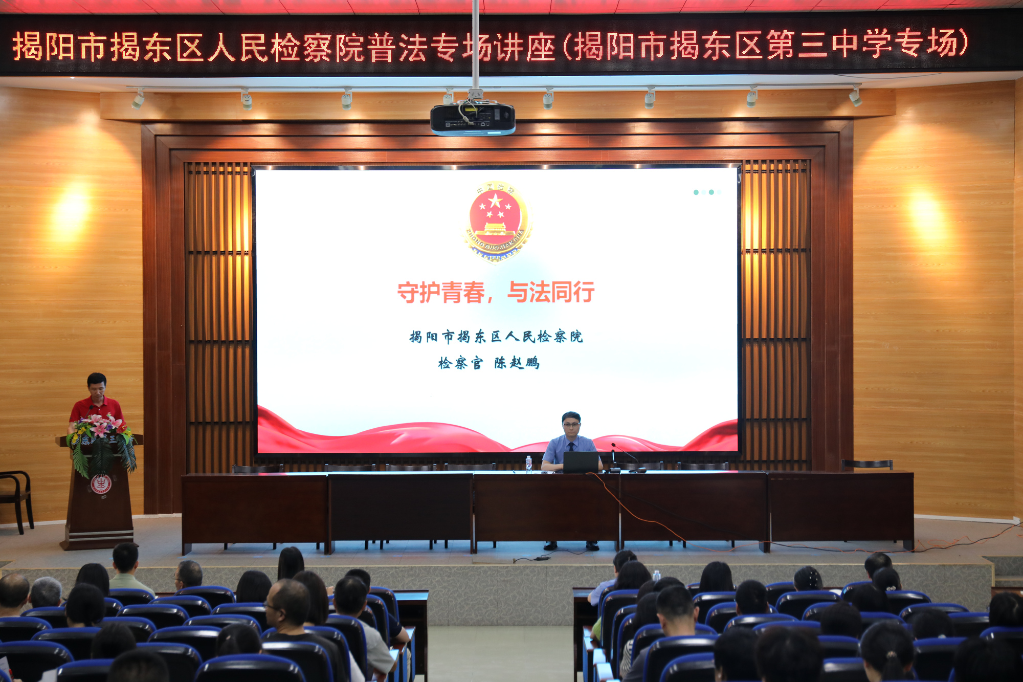 在第十一个全民国家安全日来临之际,我院党员志愿者服务队于近日走进揭东区第三中学,以“守护青春、与法同行”为主题开展法治专题宣讲活动。学校领导及全体教师在报告厅主会场现场聆听,各班级学生通过视频系统在教室同步收看。