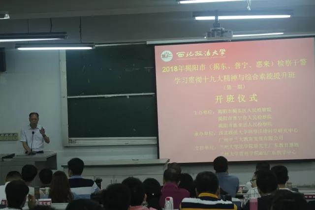 西北政法大学律师学院副院长刘仁琦、揭东区检察院林楚峰检察长、惠来县检察院陈哲鑫检察长、普宁市检察院邬郁彬副检察长,以及来自揭东、普宁、惠来三地的100多名检察干警参加了开班仪式。仪式由西北政法大学教授、硕士生导师丁岩林主持。
