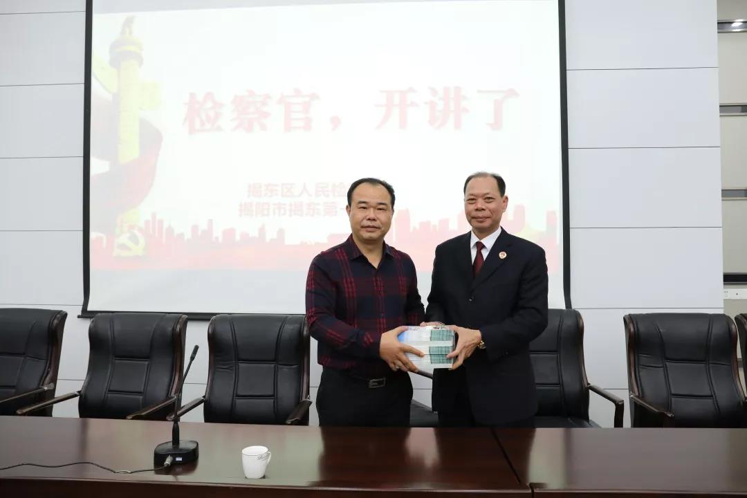 下课后,林楚峰检察长向揭东一中学生赠送了我院编写的普法丛书。面对着莘莘教诲和厚重期望,学生们以热烈掌声回应了两位校长的期待。